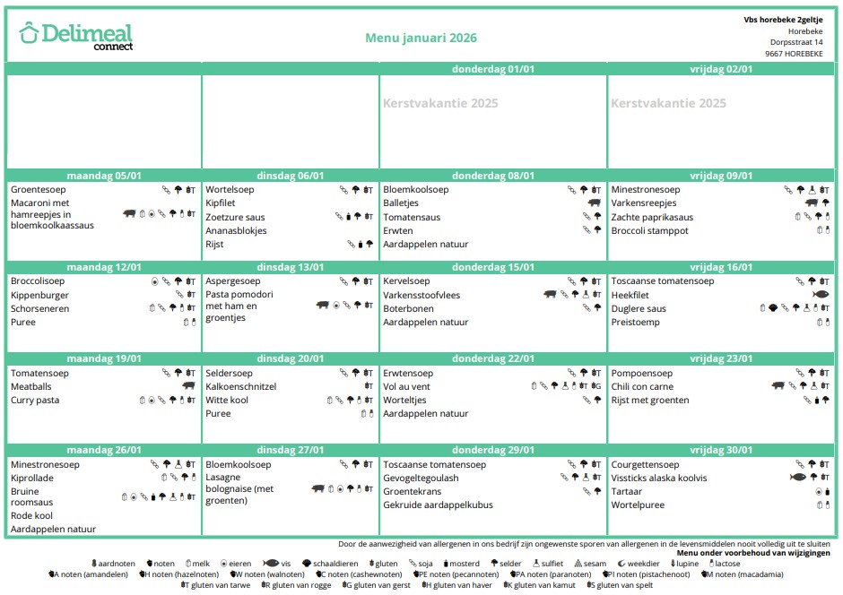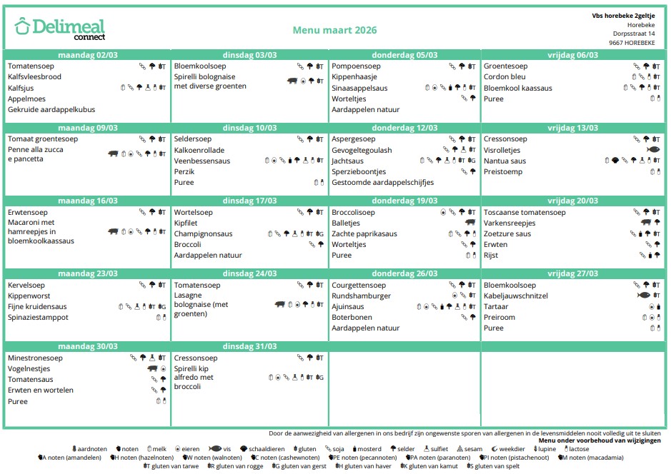 Menu Onze maaltijden worden geleverd door Delimeal.Je kan inschrijven per trimester.Bij afwezigheid van een leerling wegens ziekte kan men het secretariaat verwittigen tussen 8u00 en 8u30 op het nummer 0468/22.18.74 Vind-ik-leuk Aan het laden...