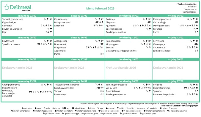 Menu Onze maaltijden worden geleverd door Delimeal.Je kan inschrijven per trimester.Bij afwezigheid van een leerling wegens ziekte kan men het secretariaat verwittigen tussen 8u00 en 8u30 op het nummer 0468/22.18.74 Screenshot Vind-ik-leuk Aan het laden...